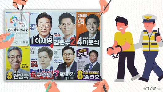 경찰청에 따르면 19일 기준 대선 관련 범죄 사건으로 단속된 363명 중 185명이 현수막·벽보 훼손 건으로 수사받고 있으며 이 중 1명은 구속됐습니다. 12일 공식 선거운동이 시작된 지 열흘 만에 이미 200건에 가까운 홍보물 훼손 사건이 발생한 만큼 선거일이 다가올수록 관련 범죄가 늘어날 것으로 예상되는데요. 훼손 사범이 1000명 안팎을 기록할지도 모른다는 이야기도 심심찮게 흘러나오고 있는 이유죠. 계속된 훼손 사례에 이를 막기 위한 안전장치를 마련해야 한다는 지적도 나옵니다.