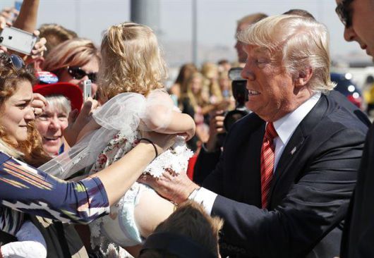 도널드 트럼프 미국 대통령이 2018년 8월 23일 미 네바다주 레노에서 아기를 안으려 힘겨운 표정을 짓고 있다. AP 연합뉴스
