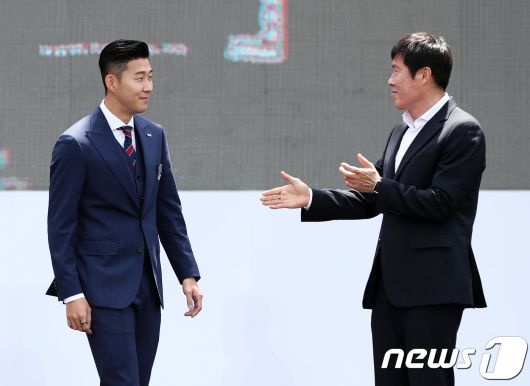 축구대표팀 에이스 손흥민이 21일 서울광장에서 열린 2018 러시아월드컵 출정식에서 차범근 전 감독과 함께 런웨이에 오르고 있다. 2018.5.21/뉴스1 ⓒ News1 오대일 기자 |