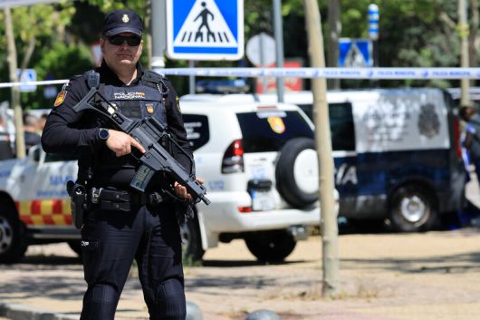 21일(현지시각) 스페인 마드리드에 있는 국제학교 앞에서 벌어진 우크라이나 전직 정치인 안드리 포르트노우에 대한 총격 사건 현장에서 경찰이 보초를 서고 있다. 로이터 연합뉴스 |