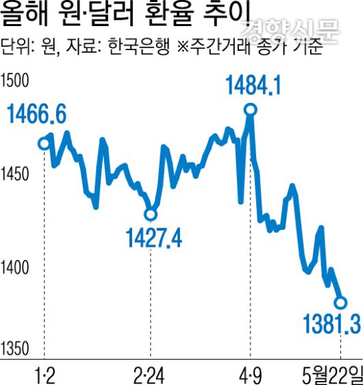 이날 서울 외환시장에서 원·달러 환율은 전날보다 5.9원 내린 1381.3원에 주간거래를 마쳤다. 이는 지난해 11월5일(1378.6원) 이후 최저치다.
