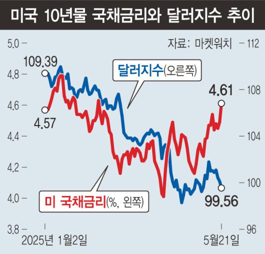 이후 세계 시장금리를 대표하는 10년 만기 미 국채 금리가 급등하고 있다. 마켓워치 자료를 보면, 21일(현지시각) 전날에 견줘 0.12%포인트 오른 연 4.61%에 거래를 마쳤다. 이 금리는 트럼프 대통령이 상호관세를 발표한 4월2일 연 4.13%에서 4월11일 4.49%로 치솟으며 세계 투자자들의 ‘탈달러’ 우려를 불러일으켰다. 그 뒤 무역 긴장이 완화하면서 4월30일 4.16%까지 떨어졌으나 다시 상승하며 전고점을 넘어선 것이다.