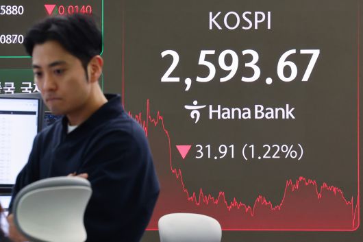 22일 코스피는 전장보다 31.91포인트(1.22%) 내린 2593.67에 거래를 마감했다. 코스피 종가가 2600선을 밑돈 것은 지난 7일(2577.27) 이후 보름 만이다. 10.92포인트(0.42%) 떨어진 2614.66에 거래를 시작한 코스피는 장 초반 외국인과 기관의 매도세가 가팔라지면서 낙폭이 점차 확대됐다. 이날 유가증권시장에서 외국인은 현물 4857억원, 선물 5239억원을 순매도하면서 현·선물을 합해 1조원 넘게 팔아치웠다.
