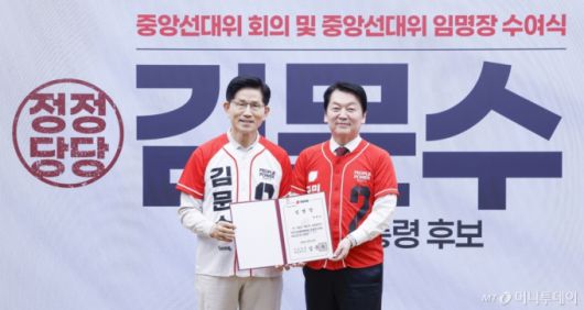 김문수국민의힘 대선후보가 12일 서울 여의도 국민의힘 중앙당사에서 열린 중앙선거대책위원회 임명장 수여식에서 안철수(오른쪽) 공동선대위원장에게 임명장 전달 후 기념촬영을 하고 있다.(공동취재) 2025.05.12. /사진=뉴시스 /사진=