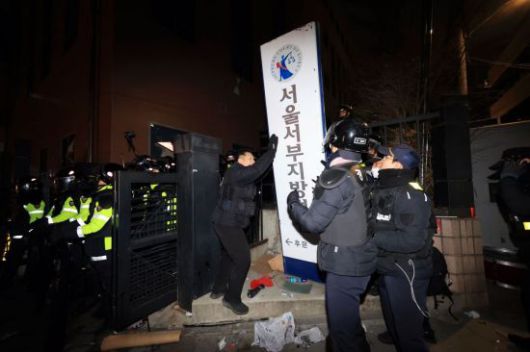 경찰이 서부지법 폭동 이후 법원 후문에서 쓰러진 현판을 세우고 있다. 연합뉴스 |