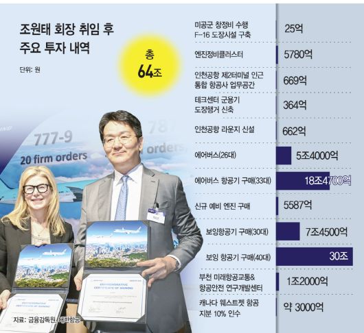 22일 항공업계에 따르면 2019년부터 현재까지 대한항공의 주요 투자 금액을 살펴보면 64조원 이상으로, 이 중 항공기 구매만 61조원이 넘는다.