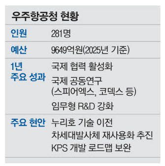 우주청은 지난해 5월 27일 한국판 미국 항공우주국(NASA)을 표방하며 출범했다. 한국항공우주연구원과 한국천문연구원을 산하에 두고 기존에 과학기술정보통신부 등의 부처에서 우주·항공 관련 업무를 이관받았다. 한국형 발사체 누리호 고도화 사업, 한국형 위성항법시스템(KPS), 한국 첫 달 궤도선 '다누리' 운영, 달 탐사선 개발 등을 넘겨받았다.