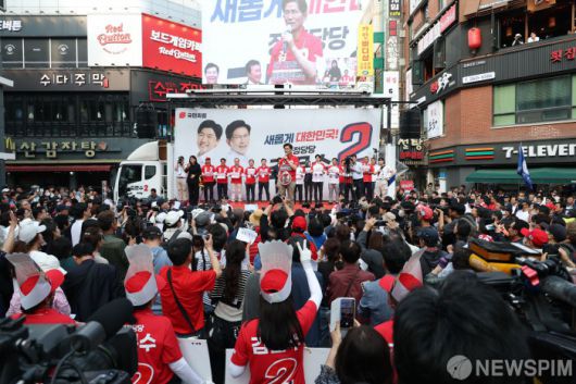[광명=뉴스핌] 최지환 기자 = 김문수 국민의힘 대선 후보가 22일 경기 광명시 철산로데오거리에서 유세를 하고 있다. 2025.05.22 choipix16@newspim.com