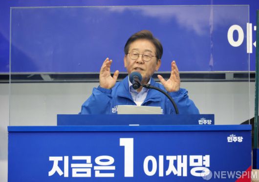 [인천=뉴스핌] 김학선 기자 = 이재명 더불어민주당 대선후보가 21일 인천 계양구 계양역 앞 광장에서 지지를 호소하고 있다. 2025.05.21 yooksa@newspim.com |