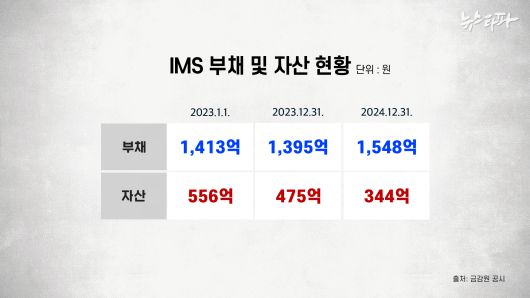그러나 당시 IMS의 투자금 유치가 눈길을 끄는 더 중요한 이유는 따로 있었는데, 바로 IMS의 심각한 재무상태였다. 금감원 공시에 따르면 투자가 있기 직전인 2023년 1월 1일 기준 IMS는 순자산보다 부채가 더 많은 자본잠식 상태였다. 회사 전체 자산은 556억 원에 불과했지만 총 부채는 3배에 가까운 1,413억 원에 달했다. 초기 적자가 많은 벤처기업의 특성을 감안한다 해도 회사 존속이 의심스러울 수준의 심각한 자본잠식 상태였던 것이다.