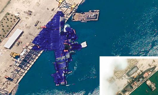 위장막으로 가렸지만… 바다위 쓰러진 구축함 북한이 새로 건조한 5000t급 구축함이 청진조선소에서 함미부터 중간부분까지 바다에 반쯤 빠진 채 넘어져 있고, 파란색 위장막으로 이를 덮어놓은 모습이 22일 영국 안보연구기관 오픈소스센터(OSC)에 의해 공개됐다. 작은 사진은 지난 18일 진수식 직전의 구축함이 촬영된 모습. OSC 엑스·로이터 |