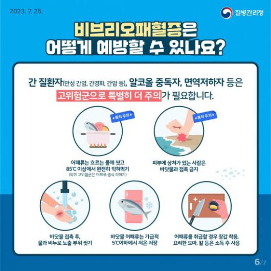 예방을 위해선 어패류를 충분히 익혀 먹고 피부에 상처가 있는 사람은 바닷물과 접촉을 피하고 어패류는 85℃ 이상 가열해 섭취해야 한다.