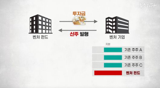 설명을 하자면 이렇다. 통상 벤처 펀드가 벤처 기업에 투자하는 경우 투자금으로 새로운 주식, 즉 신주를 발행한다. 새로운 투자자, 즉 벤처 펀드가 확보하는 신주의 지분율 만큼 기존 주주들의 지분율은 낮아지게 된다. 투자금에 대한 대가로 신주를 발행한 것이므로 당연히 투자금은 전액 회사로 들어온다.