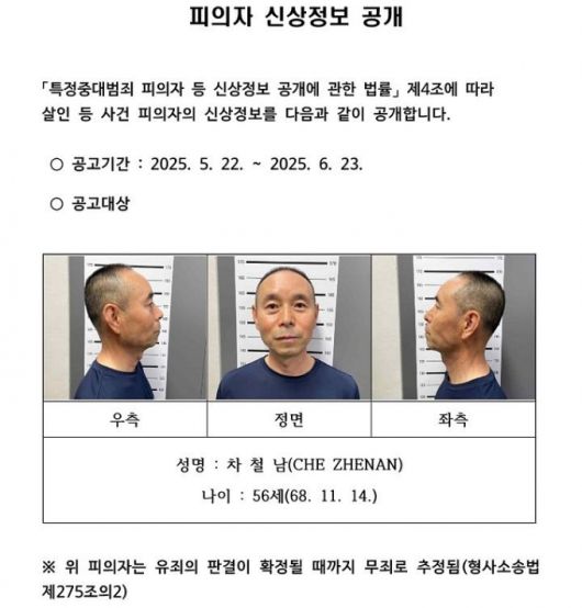 차씨는 사건 당일 공개수배되면서 이름과 생년월일, 국적, 얼굴 사진 등이 이미 알려졌다. 다만 이번 신상 공개 결정에 따라 이른바 '머그샷'이 새로 공개됐다.