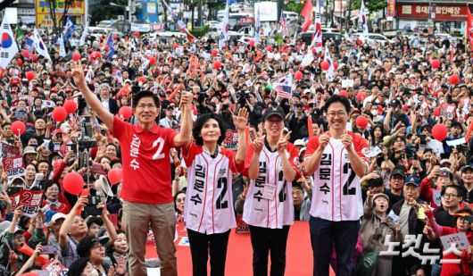 국민의힘 김문수 대선 후보와 배우자 설난영 여사, 딸 동주 씨, 사위가 22일 경기 부천시 부천역마루광장에서 열린 집중유세에서 시민들에게 지지를 호소하고 있다.저작권자 © CBS 노컷뉴스 무단전재 및 재배포 금지
