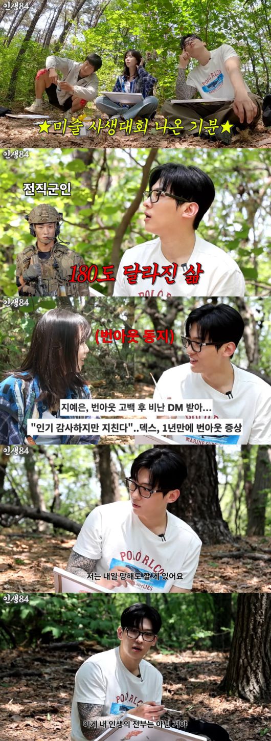 영상에서 기안84는 덱스, 지예은과 함께 청계산에 올라가 그림을 그렸다. 그림을 그리던 도중 덱스는 근황 질문이 나오자 "요즘 열심히 일한다. 예전에 비해서 일 받아들이는 마음가짐이 달라졌다"고 밝혔다.