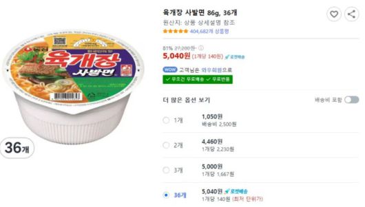 22일 유통업계에 따르면 전날 오후 11시쯤 쿠팡 판매사이트에 농심 육개장 사발면(사진) 36개들이 상품 가격이 5040원에 올라왔다. 개당 140원꼴이다. 원래 2만7000~2만8000원대에 팔리던 상품이라는 점을 고려하면 5분의 1을 밑도는 수준이다.
