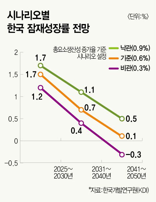 KDI는 잠재성장률이 2040년 0%로 추락하고 2040년대 후반부턴 마이너스 성장으로 곤두박질칠 것으로 경고했다. 3년 전 KDI는 성장률 0% 시점을 2050년으로 예상했는데 10년이나 앞당겨진 것. 우리 경제 잠재성장률은 2000년대 초반 연 5% 안팎이었지만 20년 만에 2%로 반 토막 난 데 이어, 15년 뒤 0%가 된다는 섬뜩한 경고다. KDI는 잠재성장률을 올해 1.8%, 내년 1.6%로 예상했다. 최근 우리 경제 실제 성장률이 잠재성장률을 밑도는 현상이 지속됐는데, 이번엔 잠재성장률 전망치마저 큰 폭으로 낮아졌다.