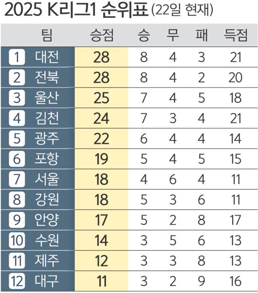 2025 K리그1에서 독주 체제를 구축했던 대전 하나시티즌이 휘청거리고 있다. 약팀을 만나도 막강한 화력이 살아나지 않는다. 대전이 최근 세 경기에서 승리를 하지 못하는 사이 명가 재건을 외치는 전북 현대와 디펜딩 챔피언 울산 HD가 매서운 기세로 선두추격에 나섰다.