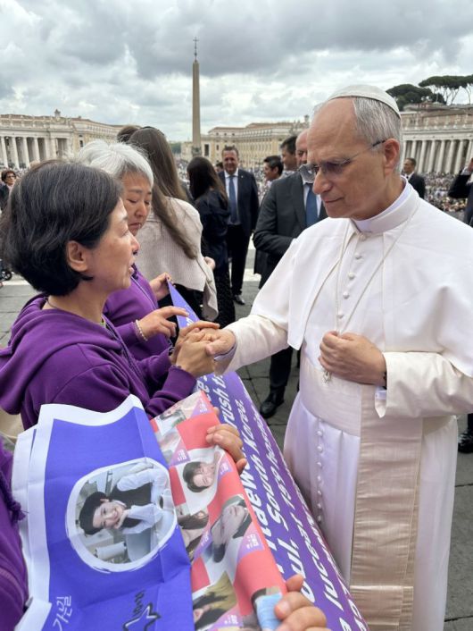 10·29 이태원 참사 시민대책회의는 21일 오전 9시(현지시간) 바티칸 성 베드로 광장에서 고(故) 이상은씨의 부친 이성환씨와 모친 강선이씨가 레오 14세 교황을 알현했다고 22일 밝혔다. 대책위 제공 |