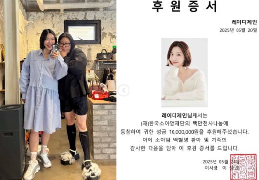 레이디제인은 22일 자신의 SNS를 통해 한국소아암재단의 후원증서를 공개했다. 재단 측은 "레이디제인 님께서는 한국소아암재단의 백만천사나눔에 동참해 귀한 성금 1천만 원을 후원해 주셨다. 이에 소아암 백혈병 환아 및 가족의 감사한 마음을 담아 이 후원 증서를 드린다"고 밝혔다.