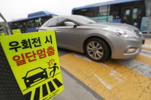 우회전 일시정지 위반 차량 단속 이틀째인 2023년 4월 23일 서울 시내 한 우회전 차로에 우회전 시 일단 멈춤 안내판이 설치되어 있다. 뉴시스 |