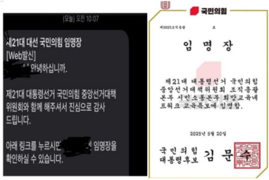 문자 메시지에는 수신자 실명과 함께 '제21대 대선 국민의힘 중앙선대위와 함께 해주셔서 감사하다'는 내용과 관련 임명장을 확인할 수 있는 인터넷 주소 링크가 포함돼 있었습니다.