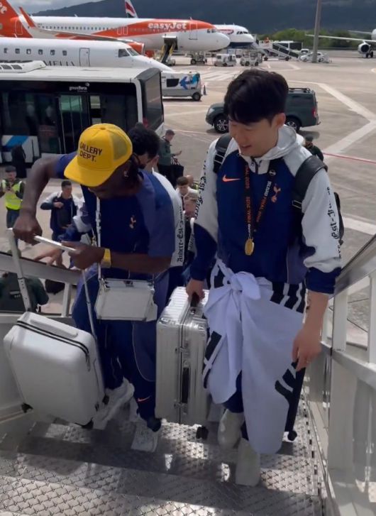 토트넘 선수들은 영국에 도착하자마자 UEFA 유로파리그 트로피와 함께 단체 사진을 찍었는데, 이때 트로피 바로 앞에 서있던 손흥민의 허리엔 여전히 태극기가 묶여 있었다.