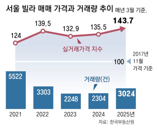 22일 한국부동산원에 따르면 올해 3월 서울 빌라 실거래가격지수는 143.7로 전월(140.9)보다 2.05% 올랐다. 이는 3개월 연속 상승으로, 2022년 6월(2.3%) 이후 가장 높은 상승 폭이다.