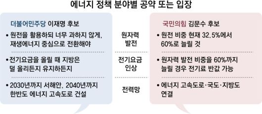 더불어민주당 이재명 후보는 인공지능(AI) 확산에 따른 전력 수요에 대응하기 위한 방법으로 원전을 활용하되 태양광·풍력 등 재생에너지 비중을 높이는 ‘에너지믹스’ 정책을 제시했다. 국민의힘 김문수 후보는 ‘원전 적극 활용’을 내걸고 원전이 전체 전력 생산에서 차지하는 비율을 현재 32.5%에서 60%까지 확대하겠다는 계획을 내놨다.