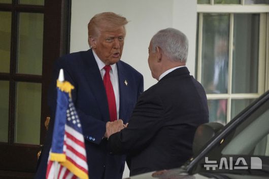 [워싱턴=AP/뉴시스]도널드 트럼프 미국 대통령이 지난달 7일(현지 시간) 백악관을 찾은 베냐민 네타냐후 이스라엘 총리와 인사하고 있다. 2025.05.23. |