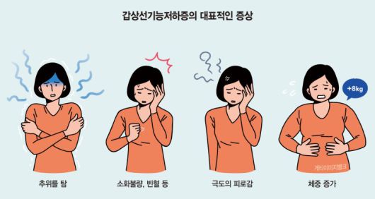 이 질환으로 인해 갑상선호르몬이 결핍되기 시작하면 가장 먼저 시작되는 것이 신체 대사 속도의 저하다. 기초대사량이 떨어지는 만큼 추위와 피로를 느끼기 쉬워지고 땀이 잘 나지 않으며 피부가 거칠고 창백해지는 것도 특징이다. 여성의 경우 월경량이 늘어나는 사례도 있다. 특히 주의를 기울여야 하는 것은 심뇌혈관 질환의 위험이다. 갑상선기능저하증 환자의 경우 의욕저하 및 기억력 감퇴, 심장맥박의 느려짐 및 심박출량 감소 등 증상을 겪을 수 있다. 실제로 대한갑상선학회는 갑상선기능저하증이 허혈성 심장질환, 인지장애, 치매 등의 위험을 높인다고 밝힌 바 있다.