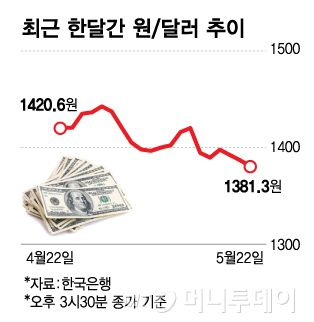22일 서울 외환시장에서 원/달러 환율 주간거래 종가는 전 거래일 대비 5.9원 내린 1381.3원을 기록했다. 이날 원/달러 환율은 전날보다 10원 넘게 내린 1377원에 거래를 시작했다. 약 6개월 만에 최저 수준이다.