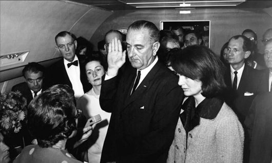 1963년 린든 존슨 부통령(가운데)이 존 F 케네디 대통령 암살 사건 발생 이후 워싱턴으로 향하는 백악관 소속 항공기에서 대통령 취임 선서를 하고 있다. AP연합뉴스 |