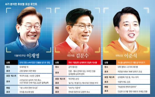 AI는 각 후보를 '무대 힘으로 편에 세우는 사람'(이재명), '칭찬으로 끌어당기는 사람'(김문수), '상대 안으로 들어가는 사람'(이준석)이라고 평가했다.