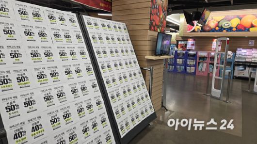 22일 찾은 서울 송파구 홈플러스 잠실점. 매장 입구부터 각종 상품을 최대 50% 할인한다는 안내문이 세워져 있었다. 내부 곳곳에도 '1+1', '절호의 특가' 등 할인 행사를 알리는 문구가 눈에 띄었다. 매장은 손님이 적은 평일 오후 시간대임을 고려해도 비교적 한산했다. 직원들은 상품 정리에 여념이 없었고, 조용한 분위기에 흘러나오는 홈플러스 CM송은 더욱 크게 느껴졌다. 대형마트 하면 빠질 수 없는 시식 코너도 찾아볼 수 없었다.