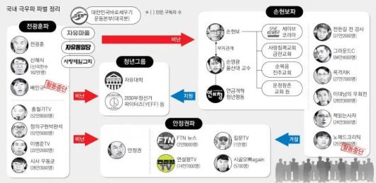 각 분파의 ‘엔진’은 유튜버들이다. 전광훈파의 핵심에는 구독자 162만명을 보유한 채널 ‘신의한수’를 운영하는 신혜식씨가 있다. 이외에도 홍철기TV(구독자 52만8000명), 정의구현 박완석(52만5000명), 이병준TV(22만2000명) 등이 보조 역할을 한다. 손현보파의 핵심에는 그라운드C(84만4000명), 전 한국사 강사 전한길씨가 운영하는 전한길뉴스(27만1000명), 목격자K(27만7000명) 등이 있다. 이들은 각 분파가 집회를 여는 곳에 참여해 메시지를 확산하는 역할을 한다. 대체로 부정선거론·혐중 정서를 주요 메시지로 삼고 있다.