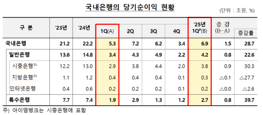 23일 금융감독원이 발표한 ‘2025년 1분기 국내은행 영업실적(잠정)’에 따르면 국내 은행의 당기순이익은 총 6조9000억 원으로 전년 동기(5조3000억 원) 대비 28.7% 증가했다.