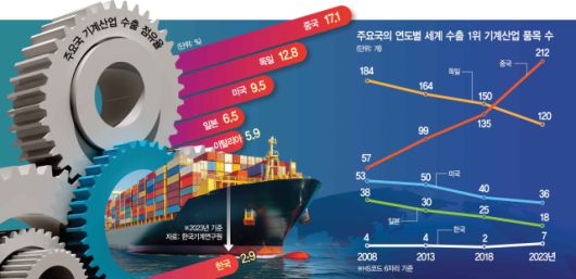 중국은 기계 산업에서 격차를 점점 벌려나가고 있다. 오승훈 기계연구원 기계정책센터장의 분석 결과 2008년 57개였던 중국의 기계 산업 수출 점유율 1위 품목은 2023년 212개로 4배 가까이 급증했다. 같은 기간 독일(184개→120개), 미국(53개→36개), 일본(38개→18개)은 중국의 추월을 허용했다. 처음에는 가격경쟁력에서 밀렸다면 어느새 기술력도 따라잡히고 말았다.