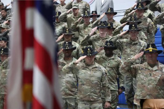 지난 2월29일 경기 동두천시 캠프 케이시에서 열린 순환배치부대 임무 교대식에서 미 육군 제3기병연대가 성조기에 경례하고 있다. 연합뉴스 |