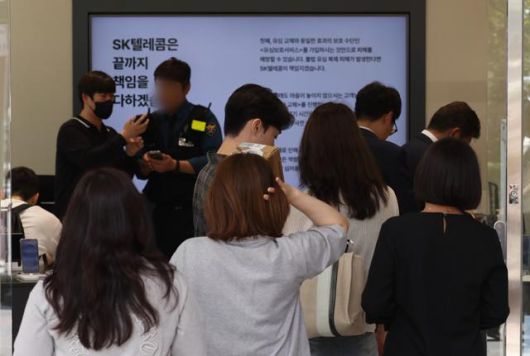 SK텔레콤이 가입자 유심(USIM) 정보가 해킹당했다는 사실을 발표한 지 한 달이 지난 22일 서울시내 한 SKT 직영점에서 가입자들이 유심 교체 상담을 받기 위해 대기하고 있다. 뉴시스 |