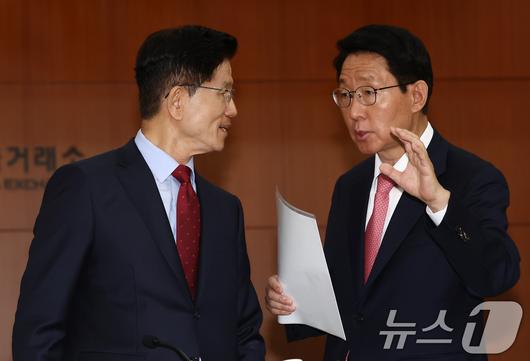 김문수 국민의힘 대통령 후보가 22일 서울 여의도 한국거래소에서 열린 중앙선거대책위원회 현장 회의에 앞서 김상훈 정책위의장과 대화하고 있다. 2025.5.22/뉴스1 ⓒ News1 김민지 기자
