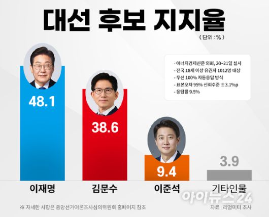 같은 날 발표된 리얼미터 조사(에너지경제신문 의뢰, 20~21일 실시)에선 이 후보가 48.1%, 김 후보가 38.6%를 기록해 격차는 9.5%p였다. 이준석 후보는 9.4%로 나타났다. (전국 18세 이상 유권자 1012명 대상 무선 100% 자동응답 방식, 표본오차 95% 신뢰수준 ±3.1%p, 응답률 9.5%, 세한 사항은 중앙선거여론조사심의위원회 홈페이지 참조))