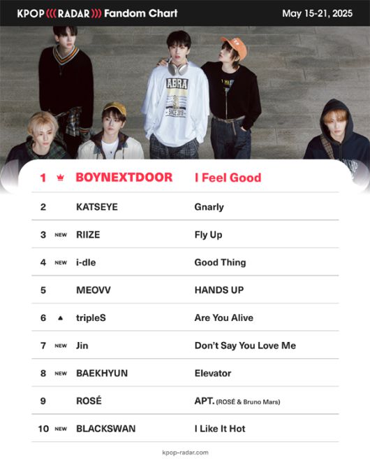 '케이팝레이더'는 23일 한 주간 팬덤 지표의 증감률을 기반으로 아티스트의 성장세를 확인할 수 있는 위클리 팬덤 차트 결과를 발표했다. 이에 따르면, 보이넥스트도어는 지난 13일 발매한 미니 4집 '노 장르(No Genre)'의 타이틀곡 '아이 필 굿(I Feel Good)'으로 정상을 차지했다.