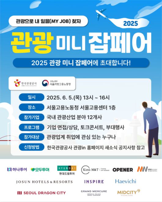 [서울=뉴스핌] 최문선 인턴기자 = 한국관광공사는 서울고용노동청과 함께 내달 5일 서울고용센터에서 '관광 미니잡페어'를 개최한다고 밝혔다.