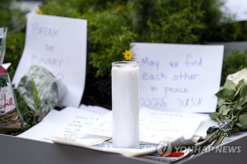 이스라엘 대사관 직원 총격 현장에 남겨진 애도 메시지와 촛불 [UPI 연합뉴스. 재판매 및 DB 금지] |