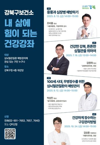 강좌는 심뇌혈관질환 예방에 관심 있는 강북구민이라면 누구나 무료로 참여할 수 있으며, 신청은 건강강좌 포스터 내 QR코드 또는 강북구보건소 건강증진과(02-901-7653, 7640, 7657)를 통해 가능하다. 접수는 선착순으로 진행된다.