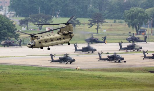 2024년 5월 21일, 세계 최대 규모의 미군 해외 주둔기지인 경기도 평택시 캠프 험프리스에서 치누크(CH-47) 헬기가 이동하고 있다./연합 |