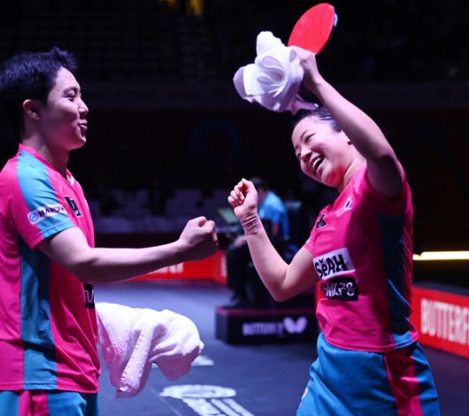 신유빈이 22일 카타르 도하 루사일 아레나에서 열린 2025 국제탁구연맹(ITTF) 세계선수권대회 혼합복식 8강전에서 승리한 뒤 임종훈과 기뻐하고 있다. 대한탁구협회 제공 |