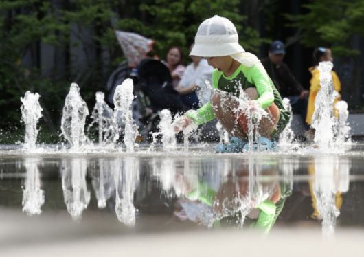 초여름 날씨를 보인 20일 오후 서울 종로구 광화문광장 분수대에서 한 어린이가 물놀이 하는 모습./사진=뉴시스 |